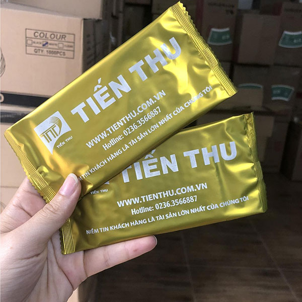 Nhắc tới các mẫu in khăn lạnh đẹp, không thể bỏ qua cái tên 107 Coffee này được. Một chiếc khăn ướt với vỏ bao màu vàng thật nổi bật, khiến người nhìn khó rời mắt được.